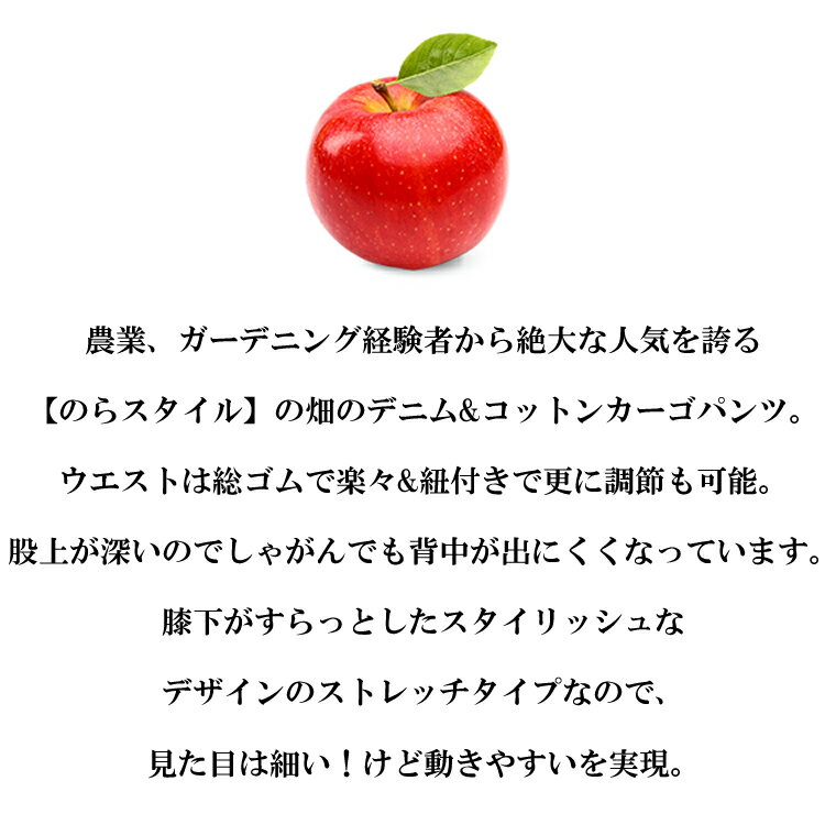 商品説明 農業、ガーデニング経験者から絶大な人気を誇る【のらスタイル】の畑のデニム&コットンカーゴパンツをご紹介! ウエストは総ゴムで楽々&紐付きで更に調節も可能。